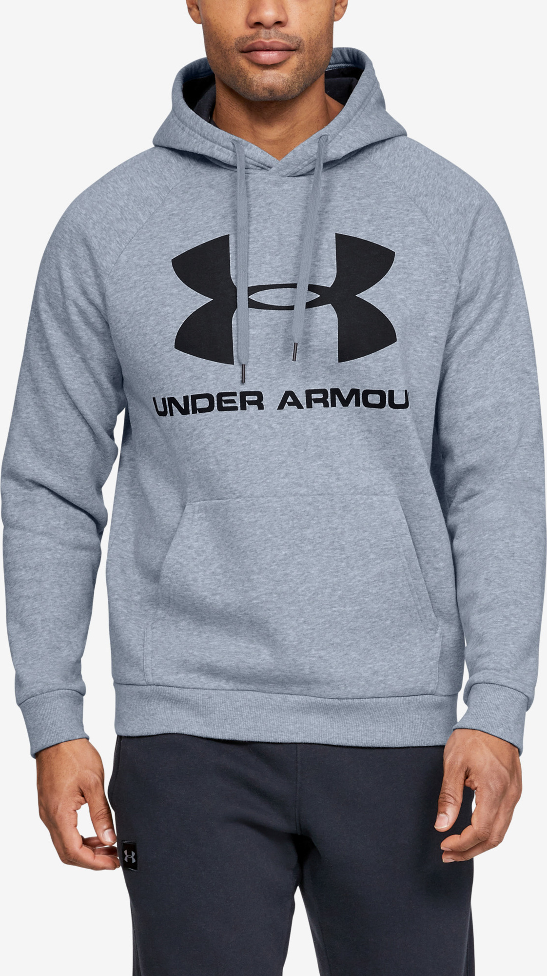 Mikina Under Armour RIVAL FLEECE SPORTSTYLE LOGO HOODIE-GRY. Pánská mikina přes hlavu s kapucí ve volném střihu z odolného, prodyšného a velmi příjemného materiálu s velkým podílem bavlny. Použitý materiál odvádí vlhkost a rychleji vysychá. Maximální pohodlí zajišťují použité technologie, střih s raglánovými rukávy poskytuje extrémní pohyblivost. Nastavitelná překřížená kapuce. Přední prostorná kapsa. Žebrované manžety a lem. Design s potiskem na hrudi. Technologie: Moisture Transport – Speciální technologie, která odvádí pot od Vašeho těla na povrch. Oděvy díky tomu lépe vysychají a udrží sportovce v suchu. Materiál: polyester